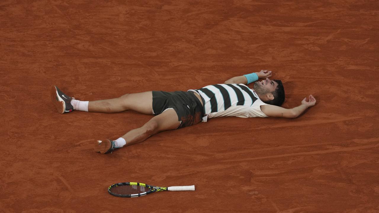 Alcaraz threw himself to the clay, barely able to believe he had prevailed in a true classic | Photo: AP